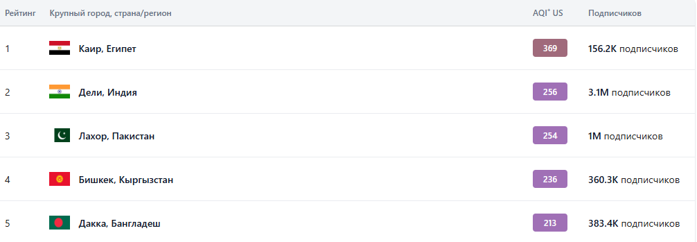 Топ-5 городов с самым загрязненным воздухом на данный момент выглядит следующим образом: