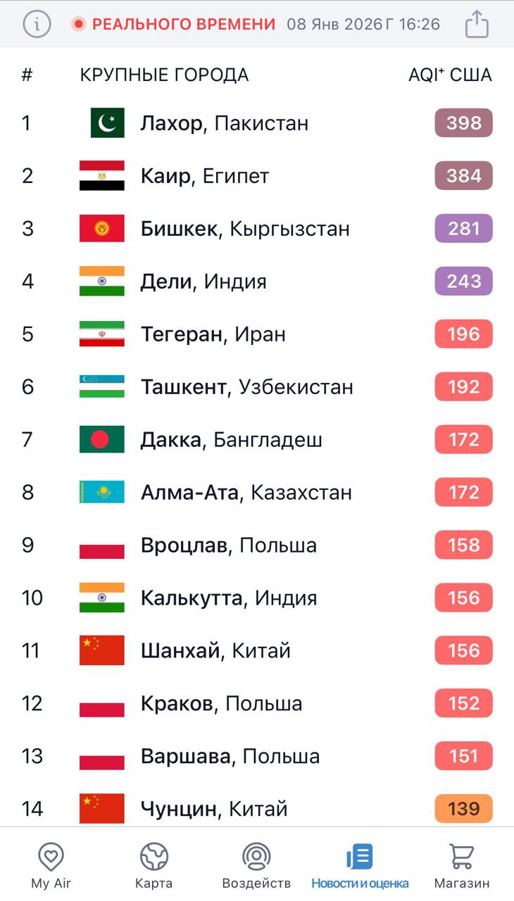 Сегодня антирейтинг возглавляет Лахор (Пакистан) с показателем AQI 398 (опасно для жизни). На втором месте Каир (Египет) — AQI 384.
