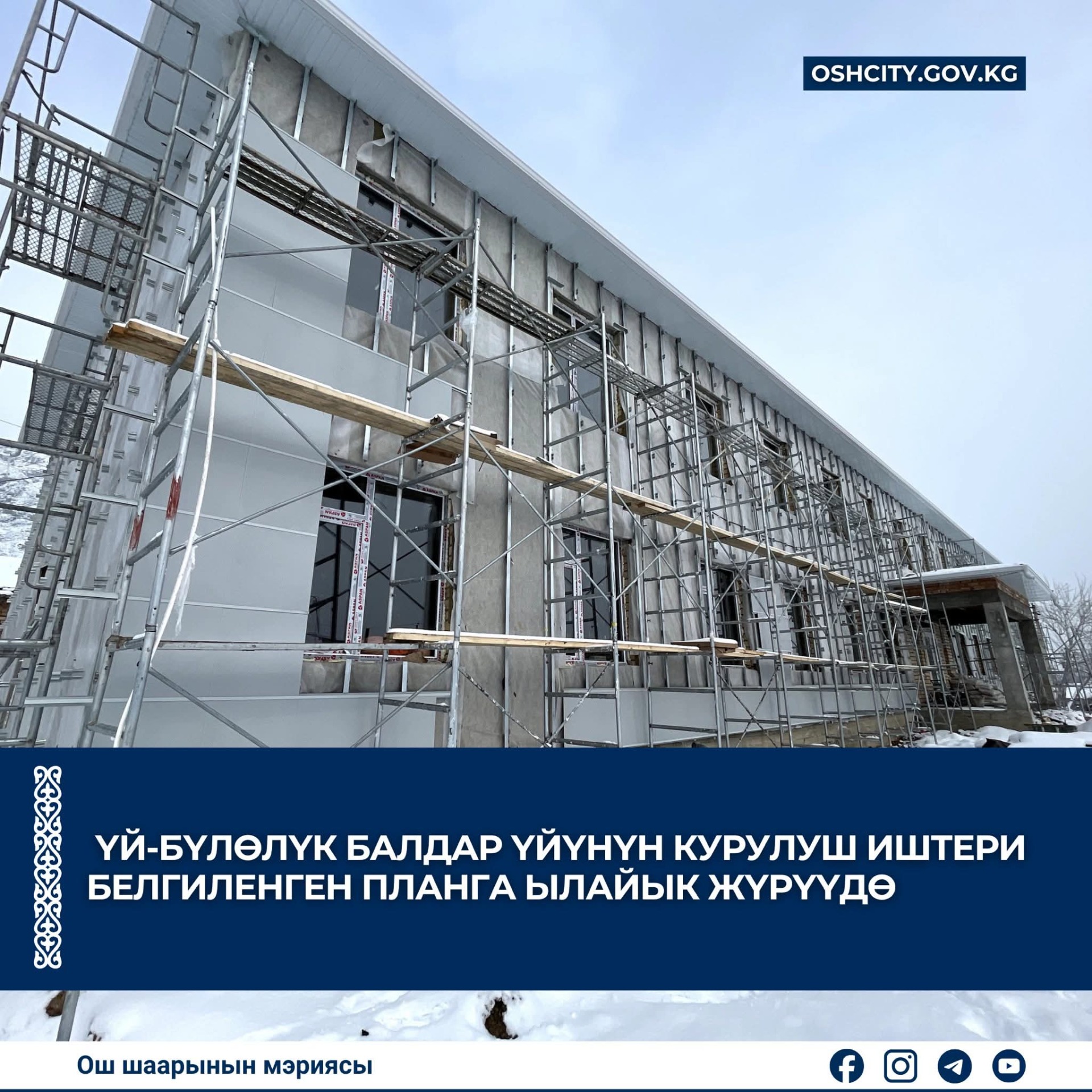 Строительство семейного детского дома в Оше продвигается по установленному плану. Об этом сообщили в пресс-службе мэрии южной столицы.