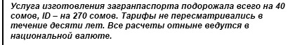 «За загранпаспорт граждане платили 6,79 евро, из них за персонификацию, то есть изготовление, - 3,27 евро. Хотя процедура идентичная в обоих случаях. Сейчас услуга будет стоить 290 сомов и за ID, и за загранпаспорт. Помимо изготовления есть еще и расходные материалы, бланк заявления, банковская комиссия. Итого выходит: получение или обмен ID-карты теперь 460 сомов (ранее – около 170), получение или обмен загранпаспорта – около 750 сомов (ранее - 545). Конечная цена зависит от причины обмена (изменение фамилии/национальности, утеря или порча), от которой зависит сумма госпошлины», - пояснила Эльзат Кыдырмышева.