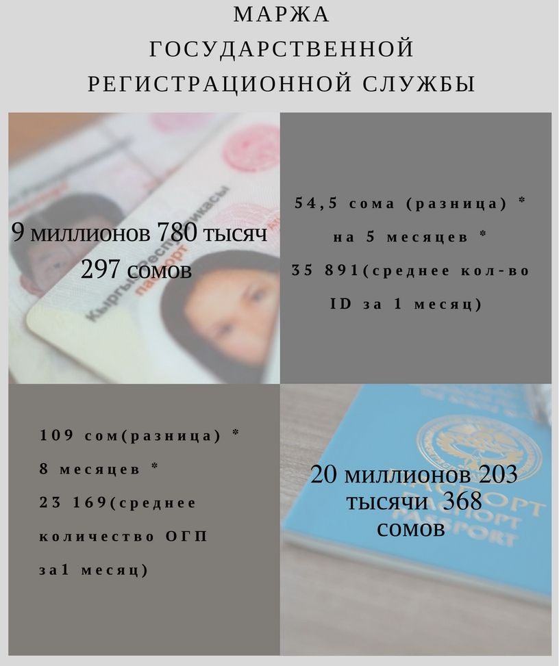 Вы только вдумайтесь: ГРС только от бланков ID получит из наших с вами карманов почти 10 миллионов сомов, а от ОГП - 20 миллионов. Не многовато ли? Теперь добавьте к этим цифрам возросшую цену на персонификацию паспортов и услуги.