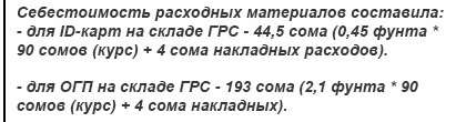 До 1 сентября 2016 года закупочная цена для ID-карт (ламинат + теслин) у «Де Ля Ру» составляла 0,45 фунта стерлингов, а для ОГП (книжка + пленка MLIS) - 2,1. В стоимость бланков вошла и доставка в аэропорт «Манас». Расходы по растаможиванию и транспортировке от аэропорта до склада ГРС составляют 4 сома на один комплект, независимо от расходных материалов, будь то ID-карта или ОГП (в расчеты взята максимальная стоимость).
