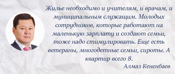 «Если кому-то мы и будем предлагать выдать жилье – врачам, допустим, учителям, какому-то видному общественному деятелю или заслуженному работнику, то эти квартиры не будут приватизироваться, они так и останутся муниципальным имуществом, - пояснил председатель горкенеша Алмаз Кененбаев. – Сессия уполномочена дать согласие, а принимает решение специальная комиссия. Нуждающихся в жилье много. Буквально недавно у меня были члены Союза чернобыльцев, которым тоже необходима жилплощадь. Недавно я награждал героя-пятиклассника, у их семьи тоже нет недвижимости, мать одна».