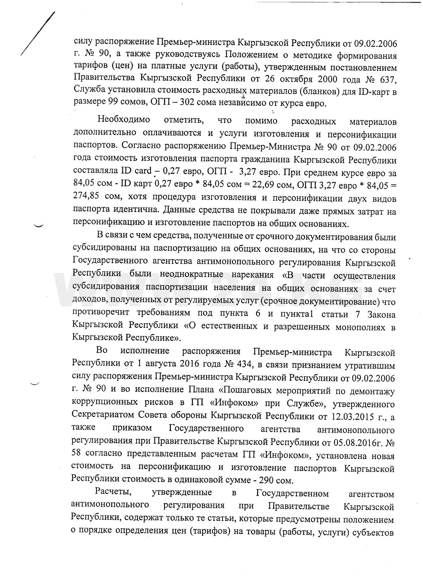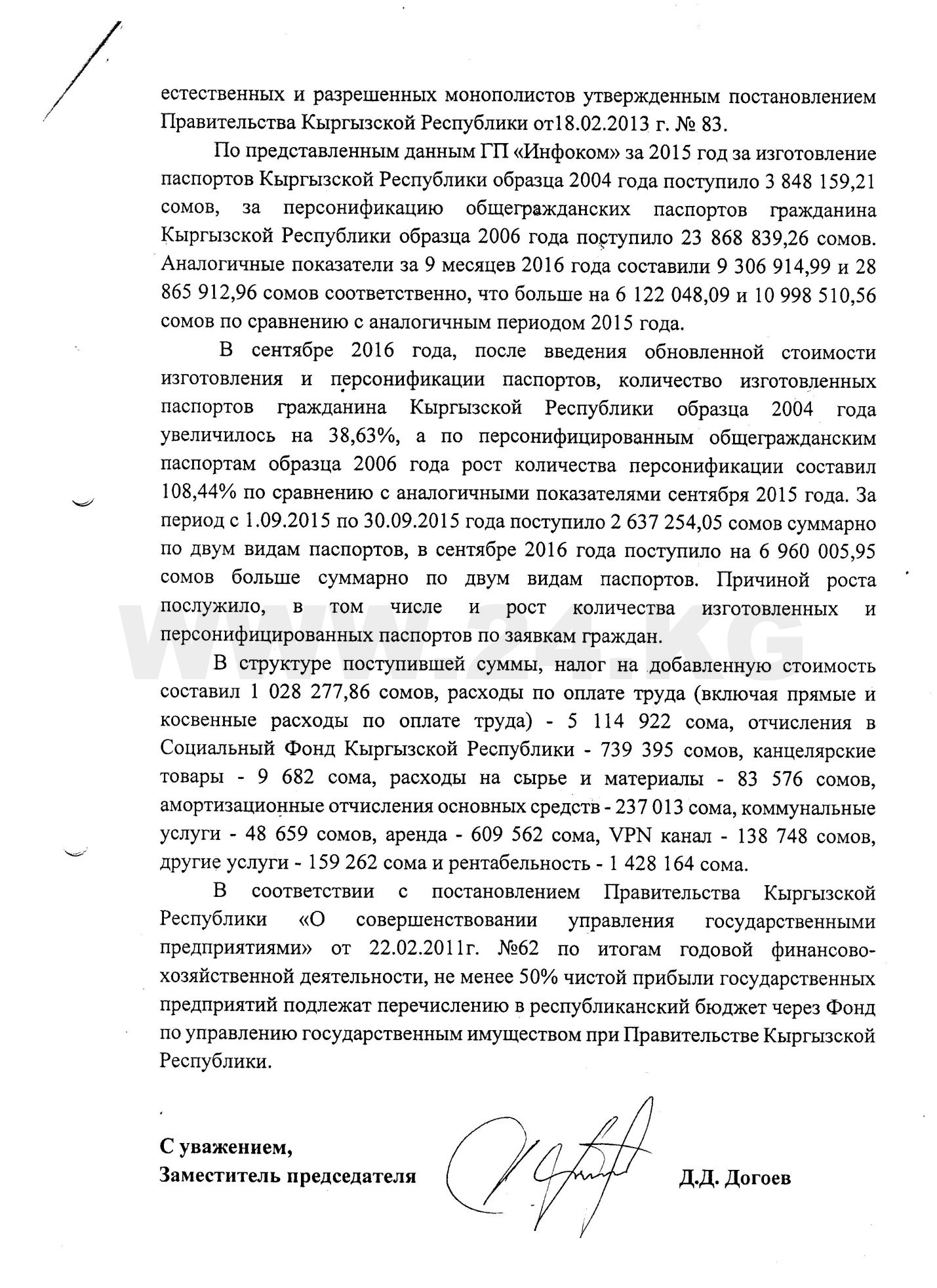 Далее Дастан Догоев отмечает, что ГРС с 2012 по 2015 год несла расходы, бесплатно выдавая ID card лицам, достигшим 16 лет и впервые получающим документ на основании постановления правительства от 31 декабря 2012 года.