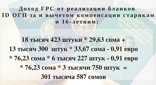 - IDcard - 76,49 сома (0,91 евро*84,05) и загранпаспорта (ОГП)- 295,85 сома (3,52 евро*84,05).