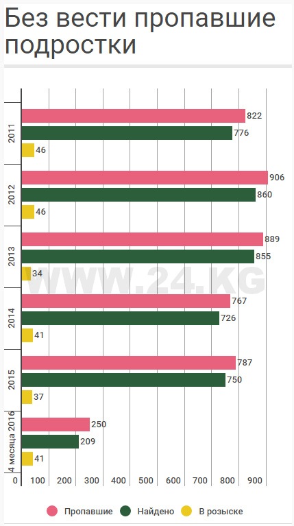 По словам начальника Инспекции по делам несовершеннолетних МВД КР Азамата Абдрахманова, статистика за 9 месяцев 2016-го по республике такова: в розыске находились 566 несовершеннолетних, в отношении 522 детей дела прекращены, то есть подростки найдены и возвращены родителям. На сегодня 44 ребенка (21 девочка и 23 мальчика) числятся пропавшими без вести.