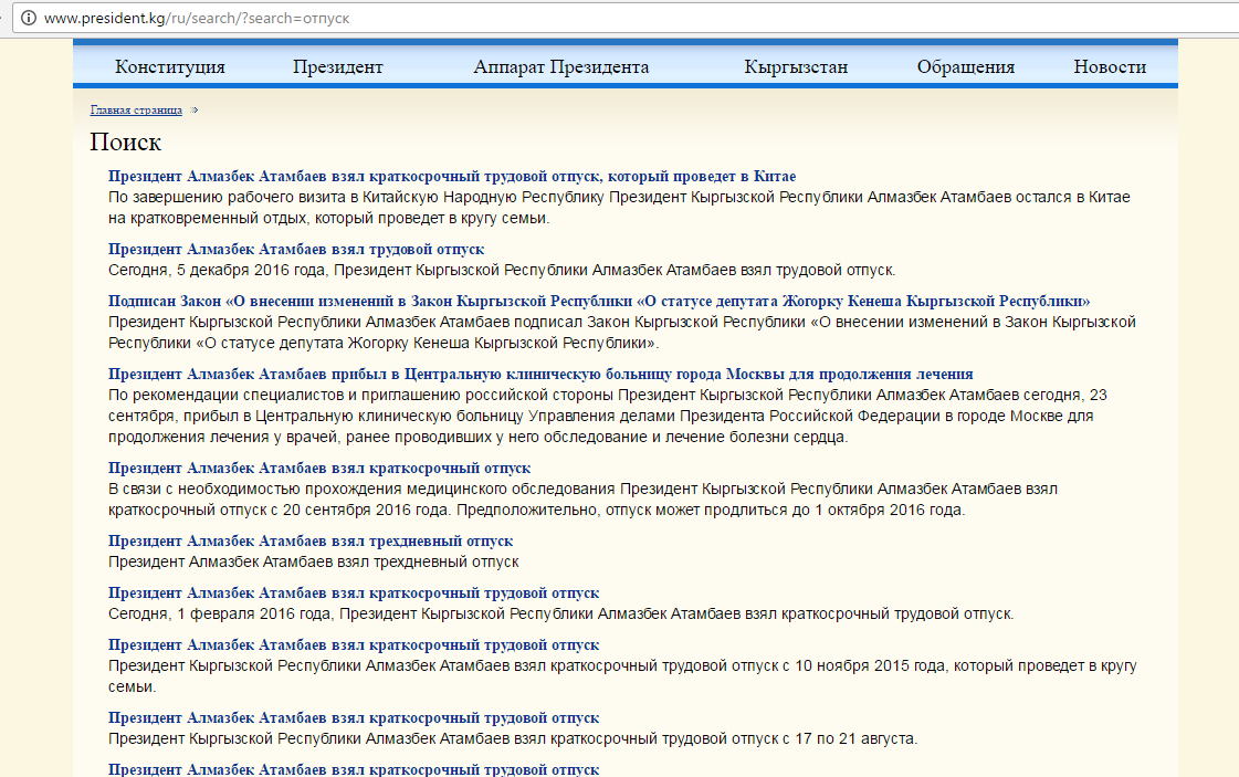 - В связи с необходимостью медицинского обследования президент Алмазбек Атамбаев взял краткосрочный отпуск с 20 сентября 2016 года. Предположительно, он продлится до 1 октября 2016 года.