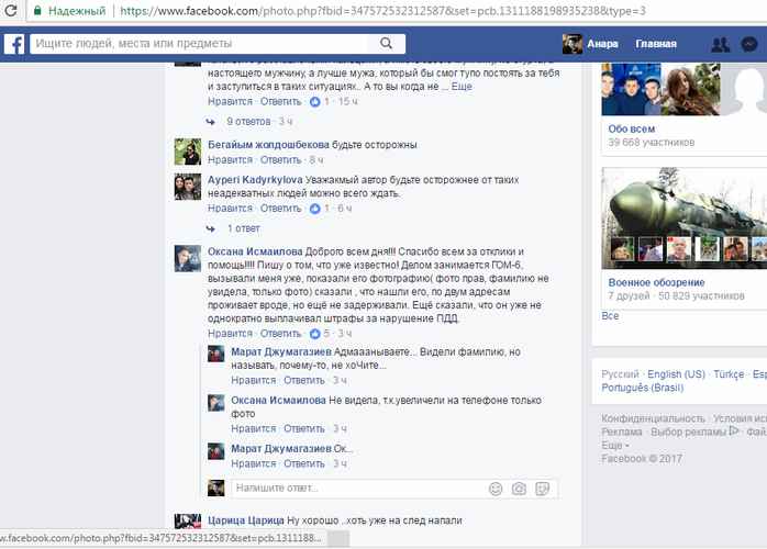 Позже заявительница сообщила в социальной сети, что ее пригласили в ГОМ и «показали его фотографию (фото прав, фамилию не увидела, только фото), сказали, что нашли его, по двум адресам проживает вроде, но еще не задерживали. Еще сказали, что он неоднократно выплачивал штрафы за нарушение ПДД».