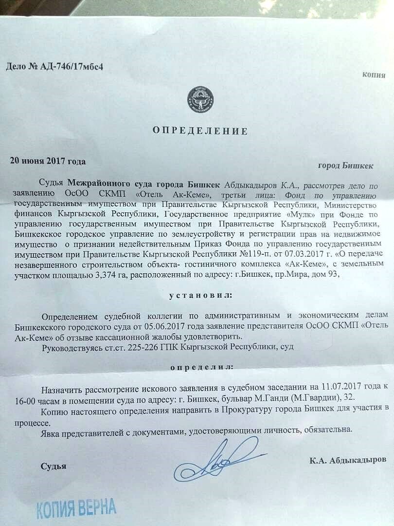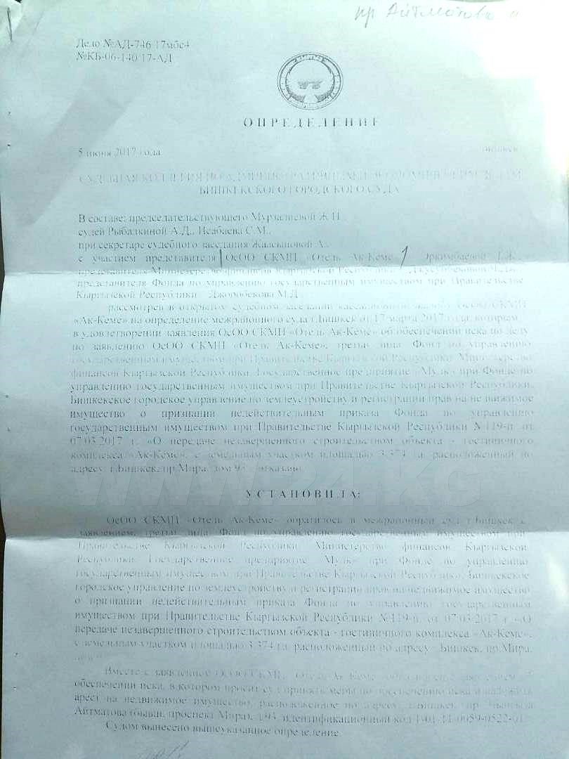 В Судебном департаменте ранее рассказали, что у судоисполнителей находится документ о взыскании с «Ак-Кеме» 452 миллионов 487 тысяч сомов в пользу Минфина.