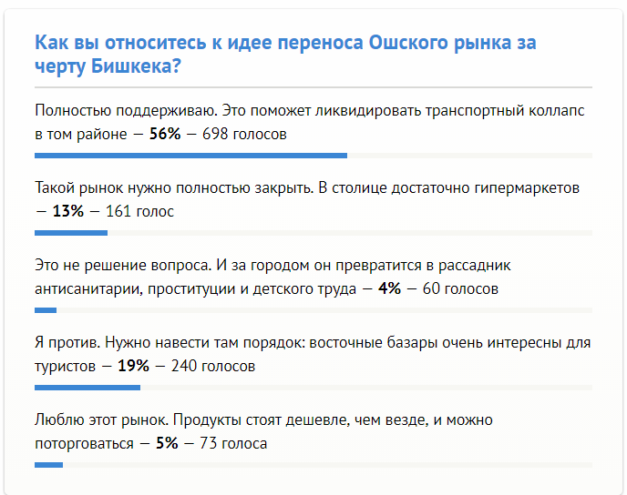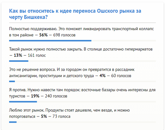 ИА «24-kg.com» предложило читателям поучаствовать в опросе и высказать свое мнение по данной инициативе. Больше половины (56 процентов, или 698 голосов) полностью поддерживают предложение, надеясь, что это поможет разгрузить дороги в районе базара.