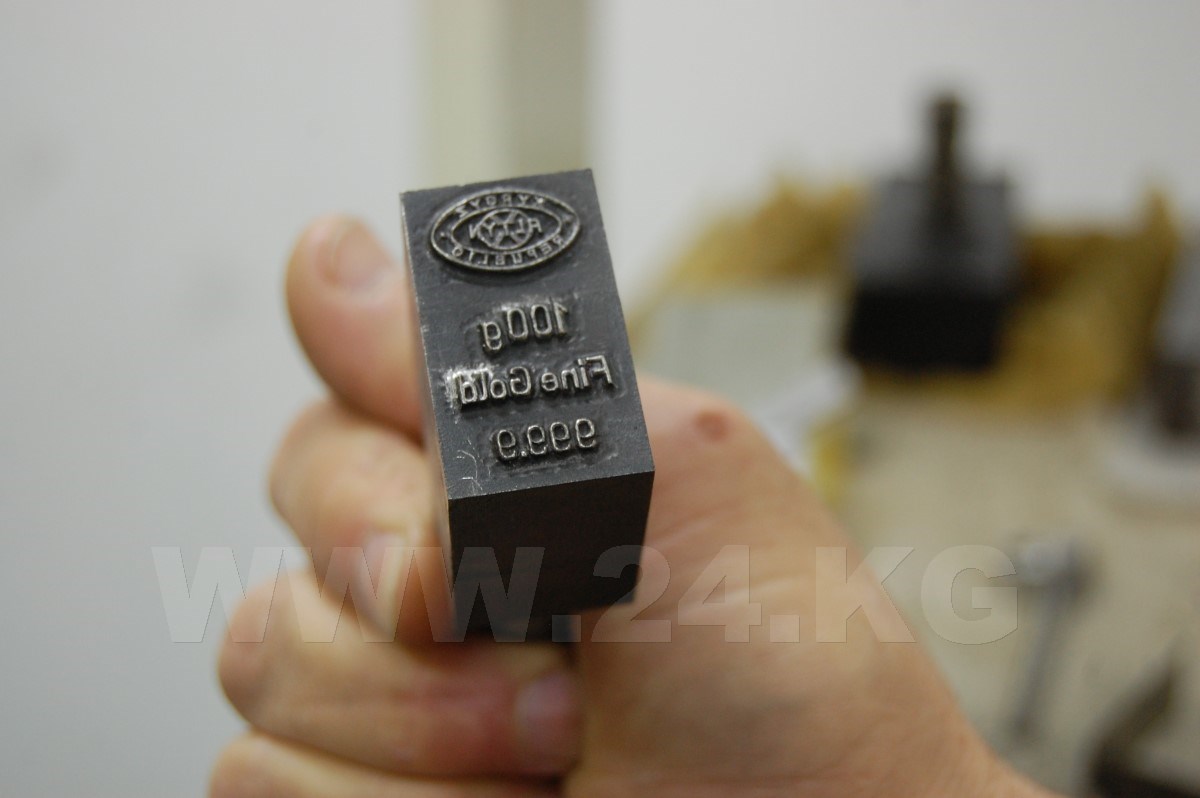 Дальше на готовые слитки аккуратно, чтобы не повредить продукт, наносят клеймо. На слитки весом в 1 килограмм и 100 граммов, кроме клейма «Кыргызалтына», обязательно наносится проба и вес.