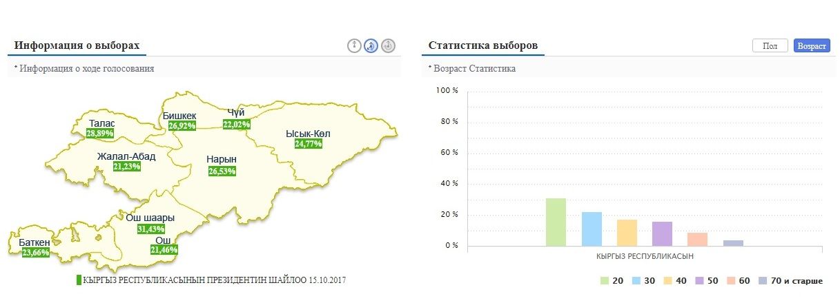 Самые активные — жители города Оша, где явка составила 31,43 процента. Самая низкая явка — в Джалал-Абаде — 21,23 процента. В Бишкеке — 26,92 процента.