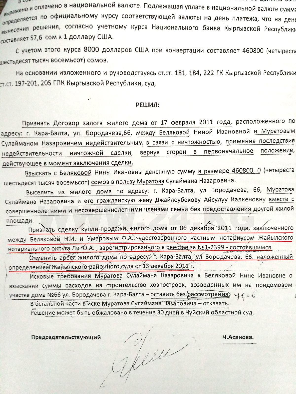 Верховный суд 29 марта 2017 года принял решение, по которому истец сам должен разыскать Нину Белякову и через суд Российской Федерации взыскать свои $8 тысяч аванса и 77 тысяч сомов за возведенные им постройки. А еще он должен освободить дом для гражданина Умарова, который каким-то чудесным образом оказался его владельцем. Якобы тот купил этот дом 6 декабря 2011-го и только в 2012 году обратился в суд, чтобы получить его.