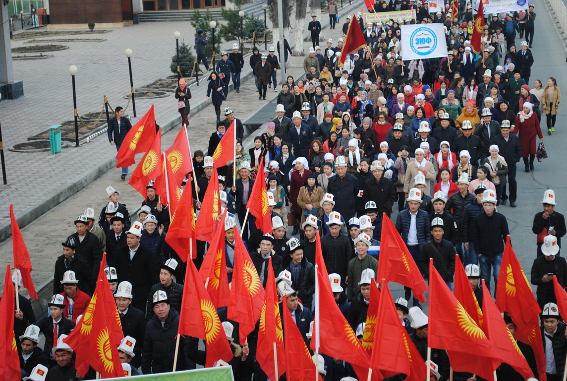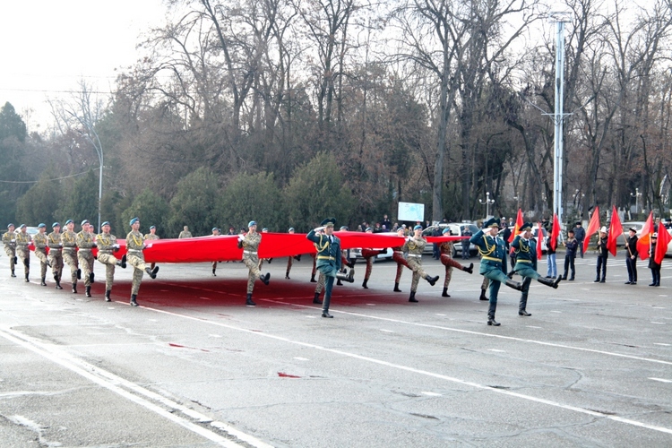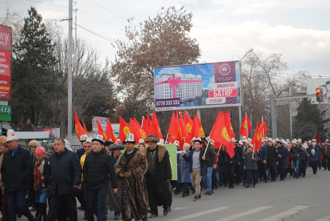 Более двух тысяч человек прошли по улицам, надев ак-калпаки и взяв в руки флаг Кыргызстана. Среди них были трудящиеся, студенты и преподаватели вузов и средних специальных учебных заведений и другие. Конечным пунктом маршрута стала центральная площадь, где прошел концерт.