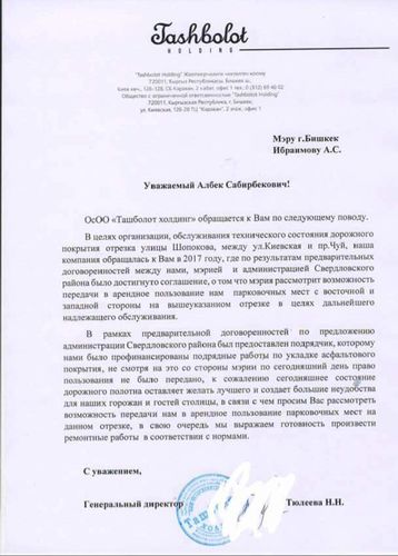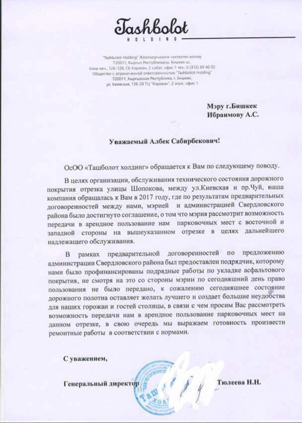 В распоряжение ИА «24.kg» передали копию письма, адресованного мэру столицы Албеку Ибраимову, от генерального директора ОсОО «Ташболот холдинг» Назгуль Тюлеевой.