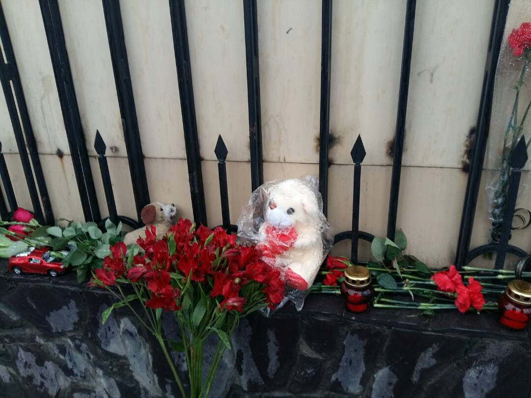 К зданию дипломатической миссии Российской Федерации в Бишкеке сегодня люди несут цветы и мягкие игрушки в память о погибших во время пожара в торговом центре «Зимняя вишня» в городе Кемерово.