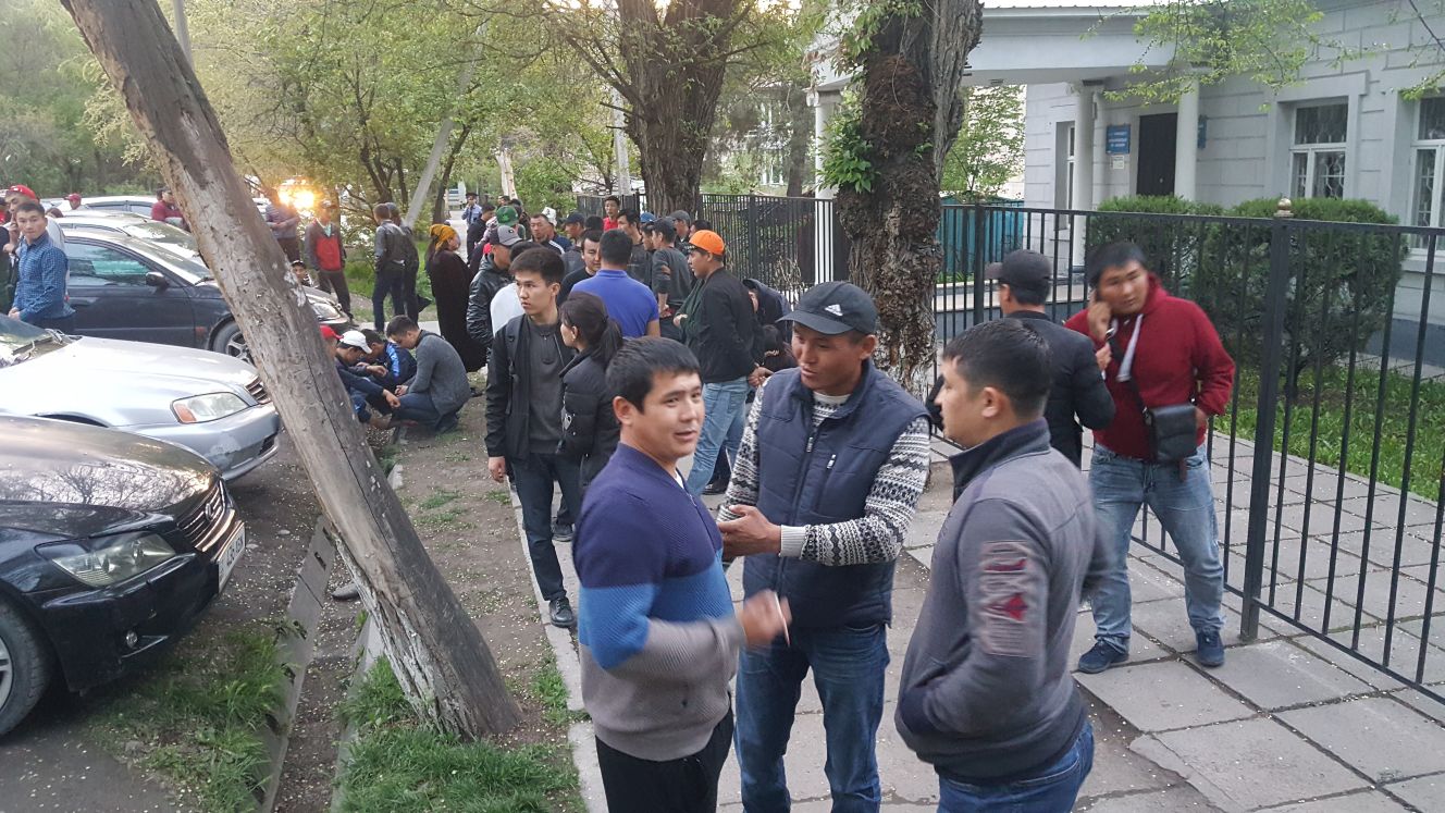 Митингующие жители Тогуз-Тороуского района Джалал-Абадской области пришли к зданию Первомайского районного суда в Бишкеке.