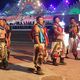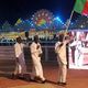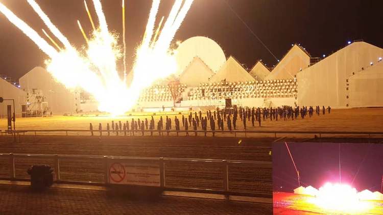 20.45. Артисты, переодетые в чертей, и чудовища на ходулях танцуют возле трибун. В это время в поле воины на корнях бьются с врагом.20.42. Номер «Борьба с темными силами». Он включает детальную сцену — борьбу 40 храбрых воинов с врагом, напавшим на землю мирного народа.