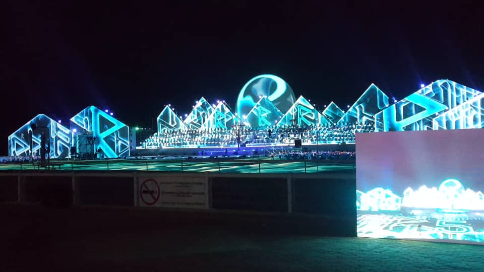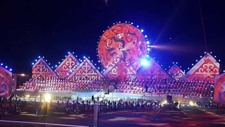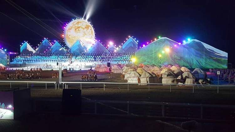 19.55. Артисты занимают места на сцене для начала театрализованного представления открытия III Всемирных игр кочевников.