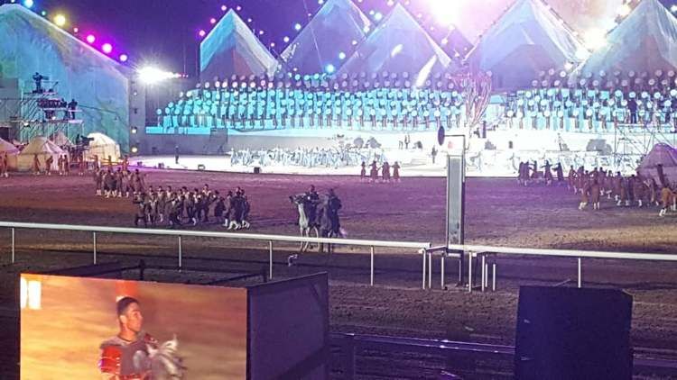 20.26. Начался номер Камбар Ата. Он повествует о неразрывной связи кочевника с лошадью и включает эксклюзивное выступление «небесных всадников».