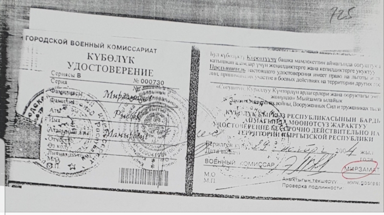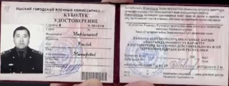 По его словам, удостоверение за номером В — 001018 выдал начальник Главного организационно-мобилизационного управления Главного штаба Минобороны Замир Молдошев.