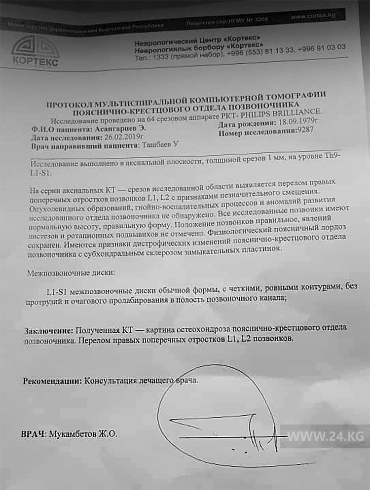 По его словам, сейчас потерпевший Эльдияр Асангариев госпитализирован в Национальный госпиталь с переломом позвоночника.