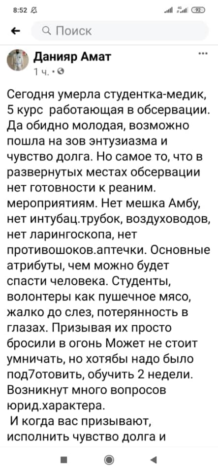 Ранее врач Национального центра охраны материнства и детства Данияр Амат также написал в соцсетях о смерти студентки, однако позже он удалил публикацию.