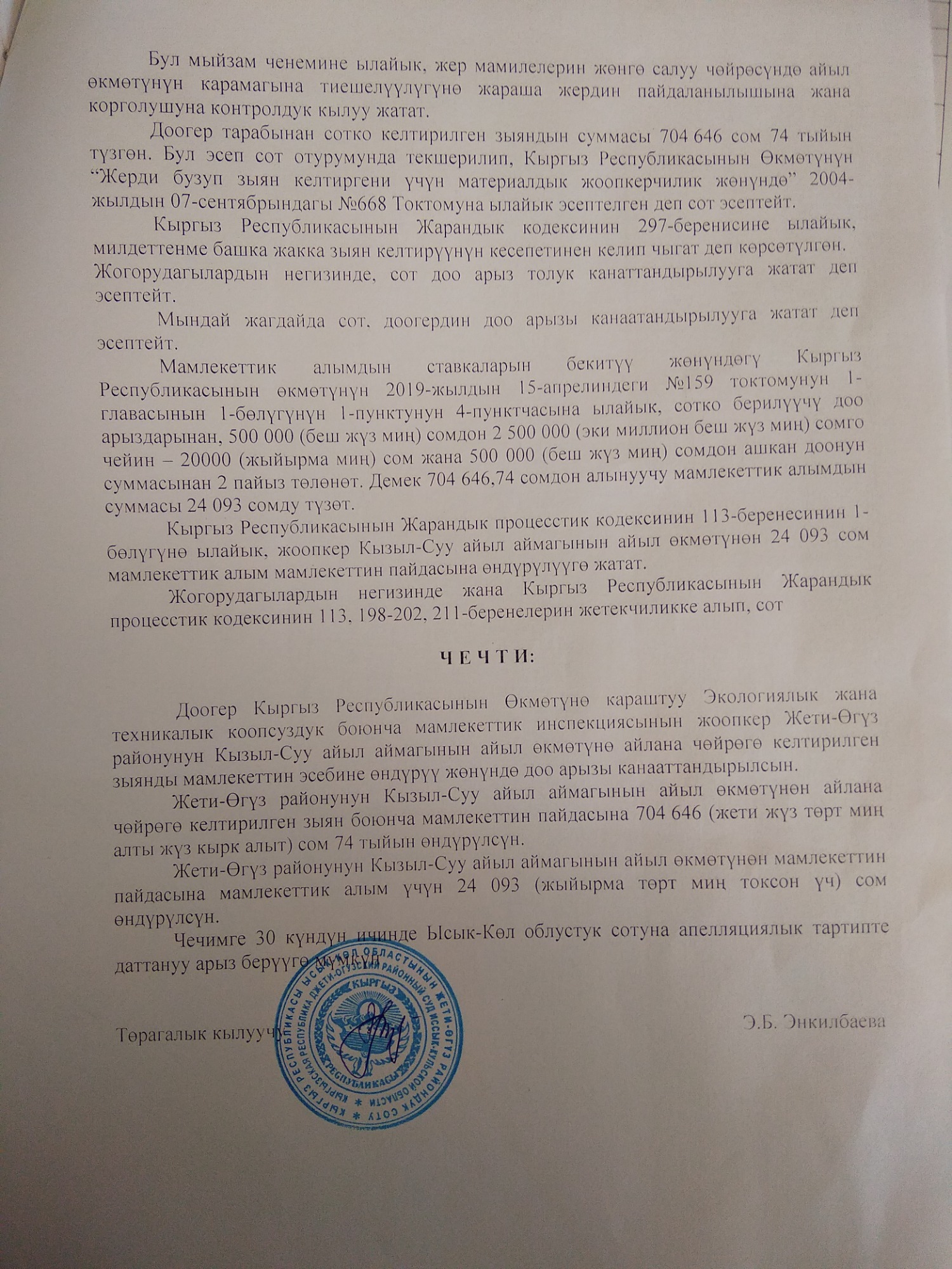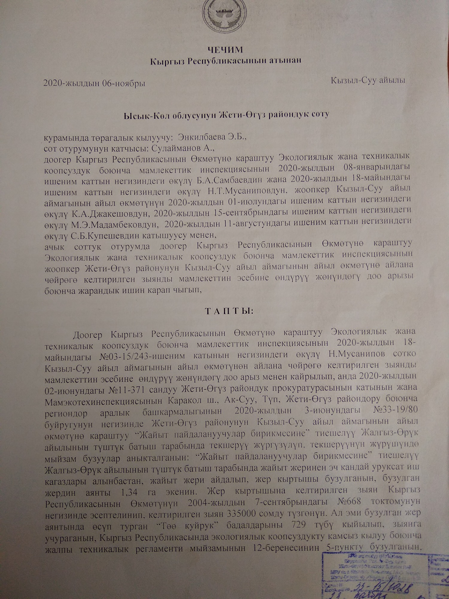 Кызыл-Суйская сельская управа Джети-Огузского района Иссык-Кульской области оштрафована на 704 тысячи 646 сомов. Об этом сегодня сообщает пресс-служба Госэкотехинспекции.