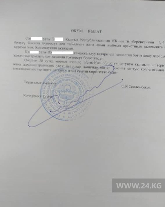 Защита получила приговор Тонского районного суда в отношении одного из оправданных по делу об изнасиловании 13-летней девочки. Об этом 24-kg.com сообщила адвокат Айнура Асанова.