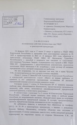 «16 февраля заместитель начальника УВДТ МВД Урматбек Матисаков не впустил в ИВС адвокатов Мырсалы Осмонкулова и Майрамбека Жумабекова для встречи со следственно-арестованным Эмиром Чукуевым. Он потребовал от них предъявления договора об оказании юридических услуг, чем грубо нарушил Уголовно-процессуальный кодекс и Закон «Об адвокатуре Кыргызской Республики и адвокатской деятельности».