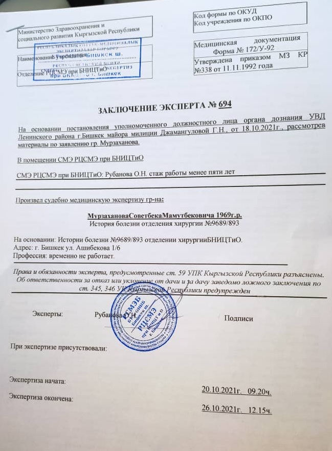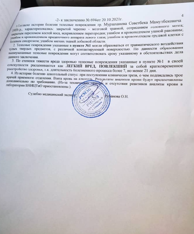 Судебно-медицинская экспертиза вынесла заключение о том, что Советбеку Мурзаханову нанесен легкий вред, повлекший за собой кратковременное расстройство здоровья.