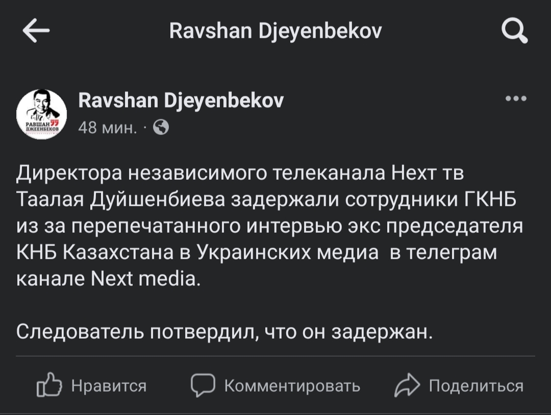 По его словам, директора СМИ задержали сотрудники ГКНБ. «Следователь подтвердил, что он задержан», — написал Равшан Джеенбеков.Пресс-центр ГКНБ недоступен для комментариев.