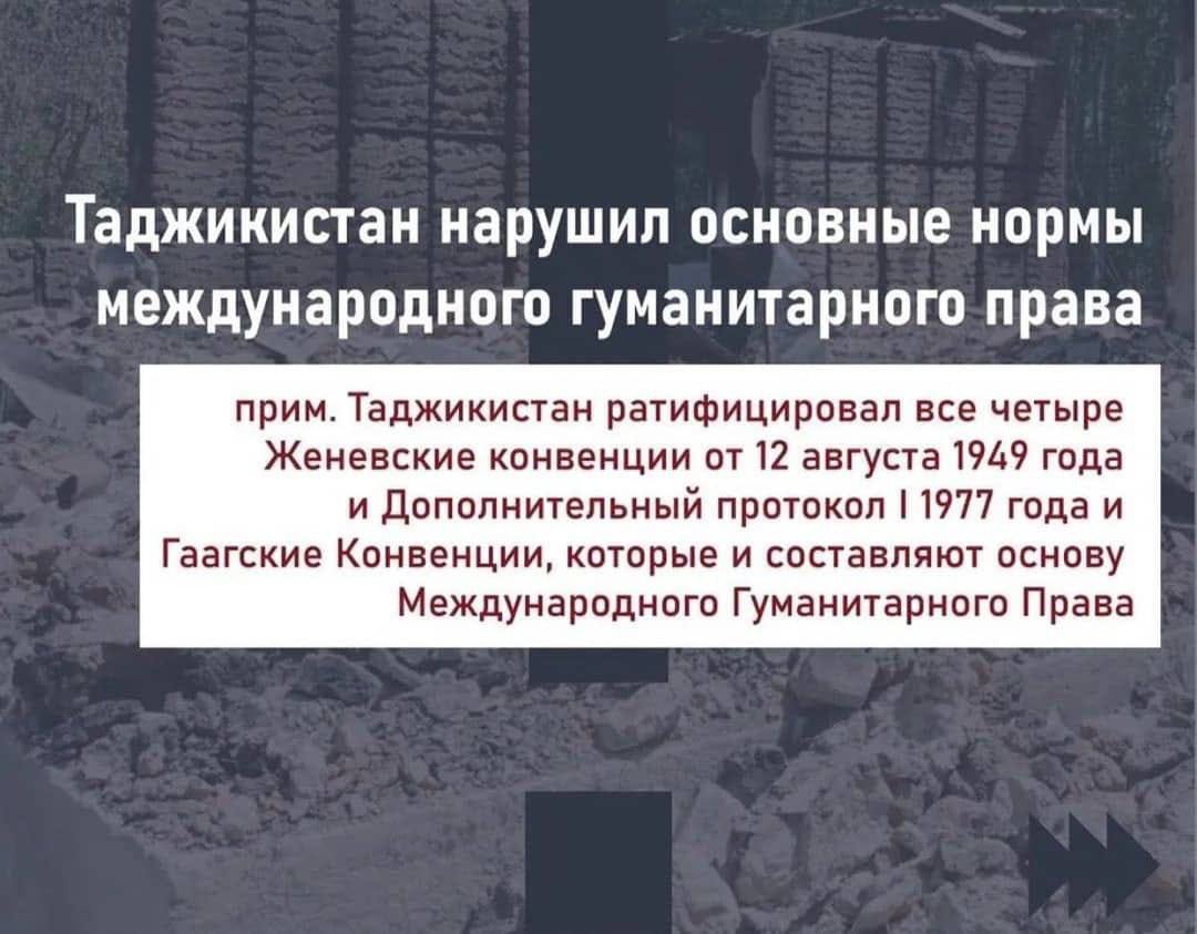 В социальных сетях распространяют информацию о том, какие нормы проигнорировал Таджикистан, начав стрельбу по селам и погранзаставам Кыргызстана. В частности, нарушены основополагающие принципы ООН и резолюция 3314 (определение агрессии) Генеральной ассамблеи ООН, а также основные нормы гуманитарного права.