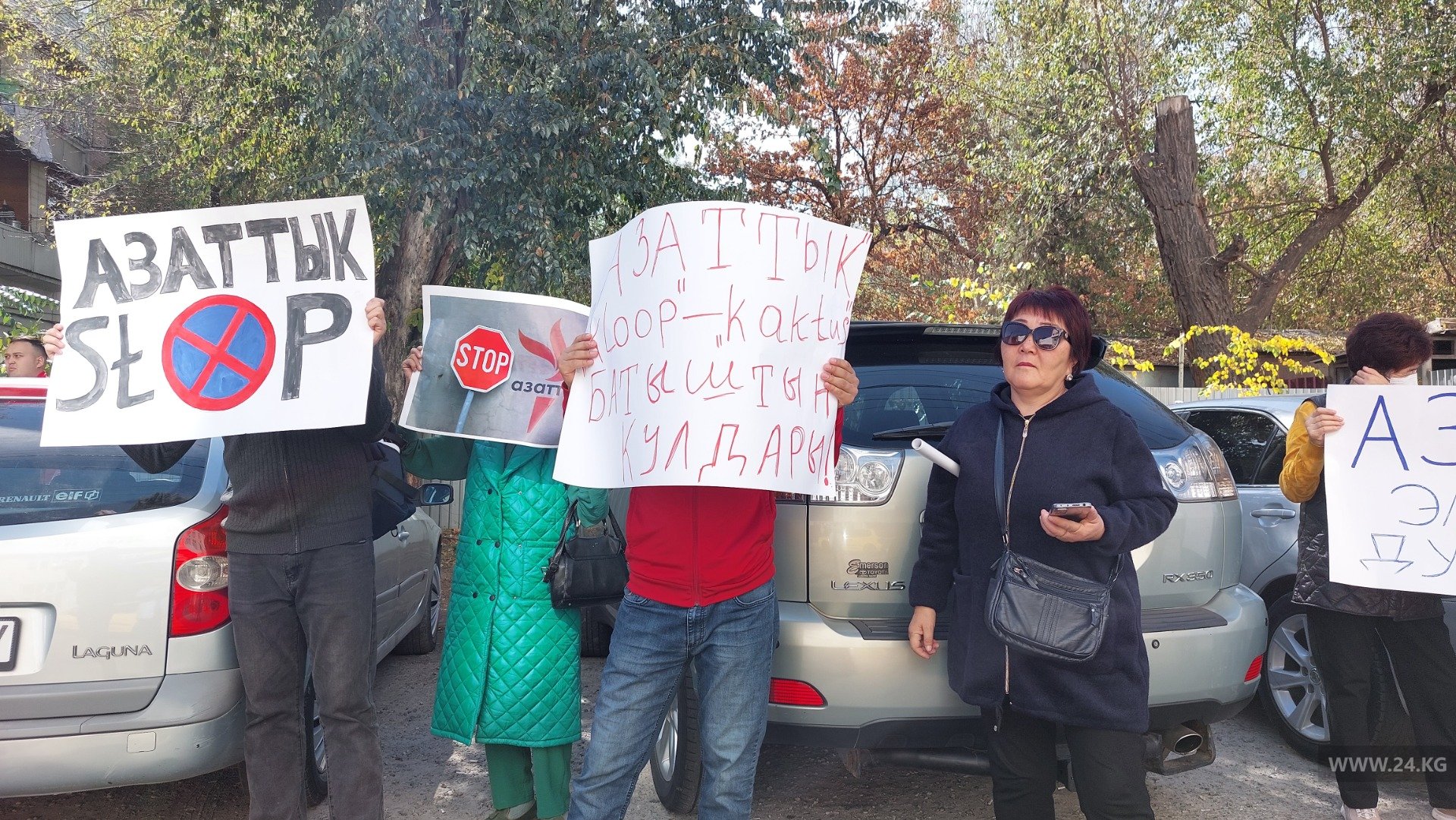 У здания, где расположена редакция Радио «Азаттык» в Бишкеке, проходит митинг. На акцию протеста собралось около 20 человек.