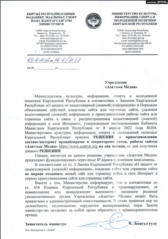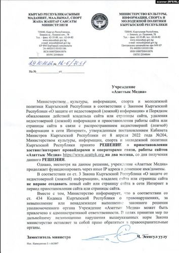 Кроме того, по данным «Азаттык Медиа», Минкультуры подозревает, что СМИ открыло новый зеркальный сайт. Такое письмо пришло в их редакцию за подписью заместителя министра культуры, информации, спорта и молодежной политики Чынгыза Эсенгул уулу.