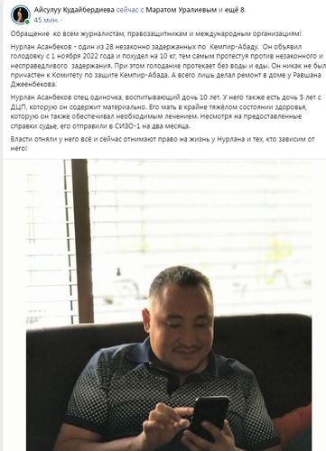 Нурлан Асанбеков — обыкновенный рабочий, он никогда не интересовался политкой и не участвовал в обсуждении стратегически важных для страны вопросов. Он не входил в созданный комитет, не принимал участия в его собрании. В день проведения массовых арестов находился на объекте, где проводил ремонтные работы в доме бывшего депутата. Но сотрудники милиции его задержали.
