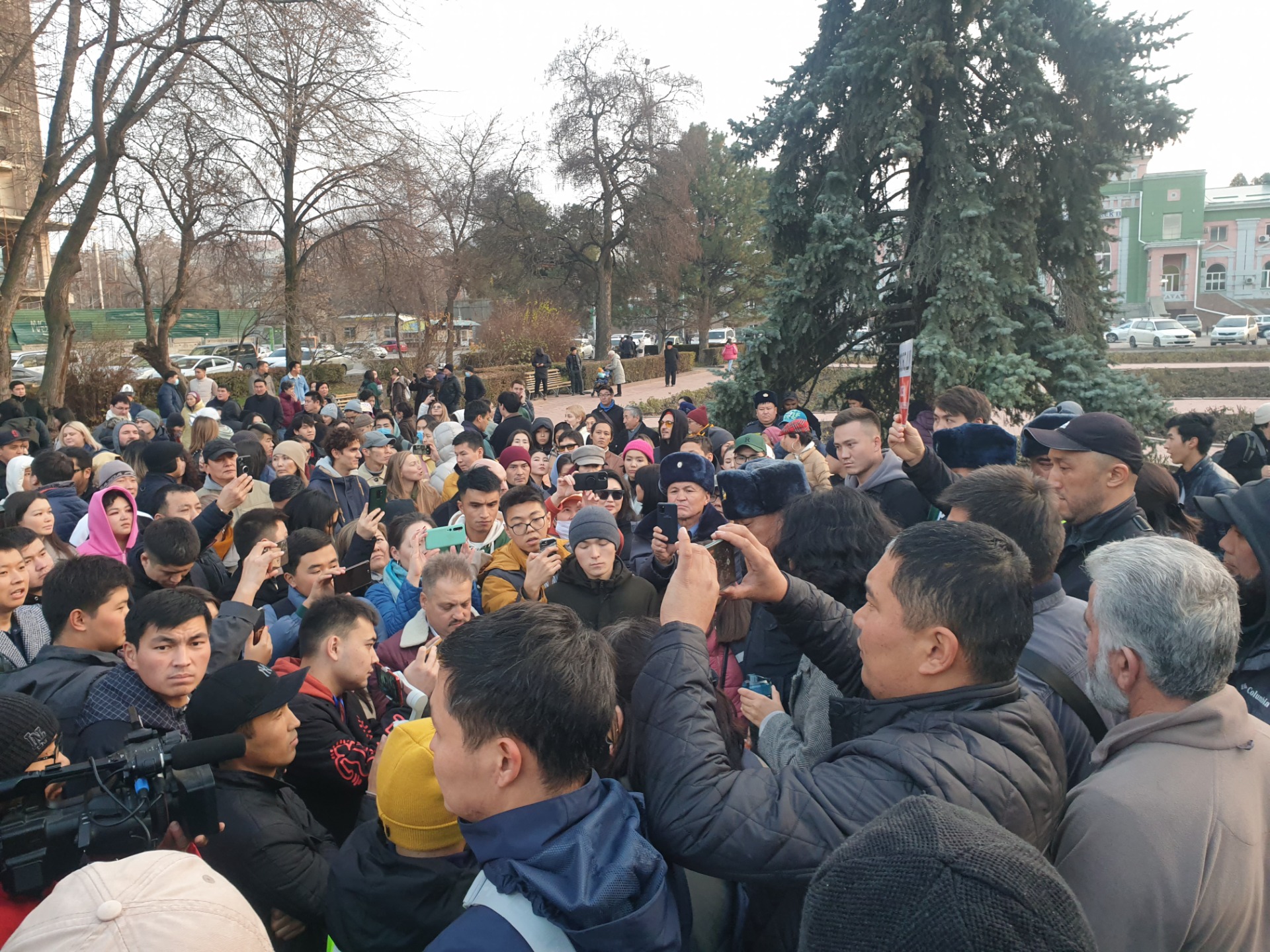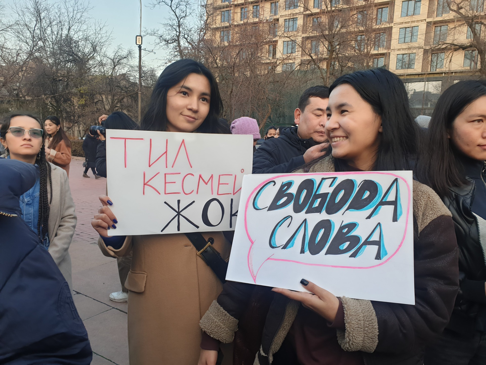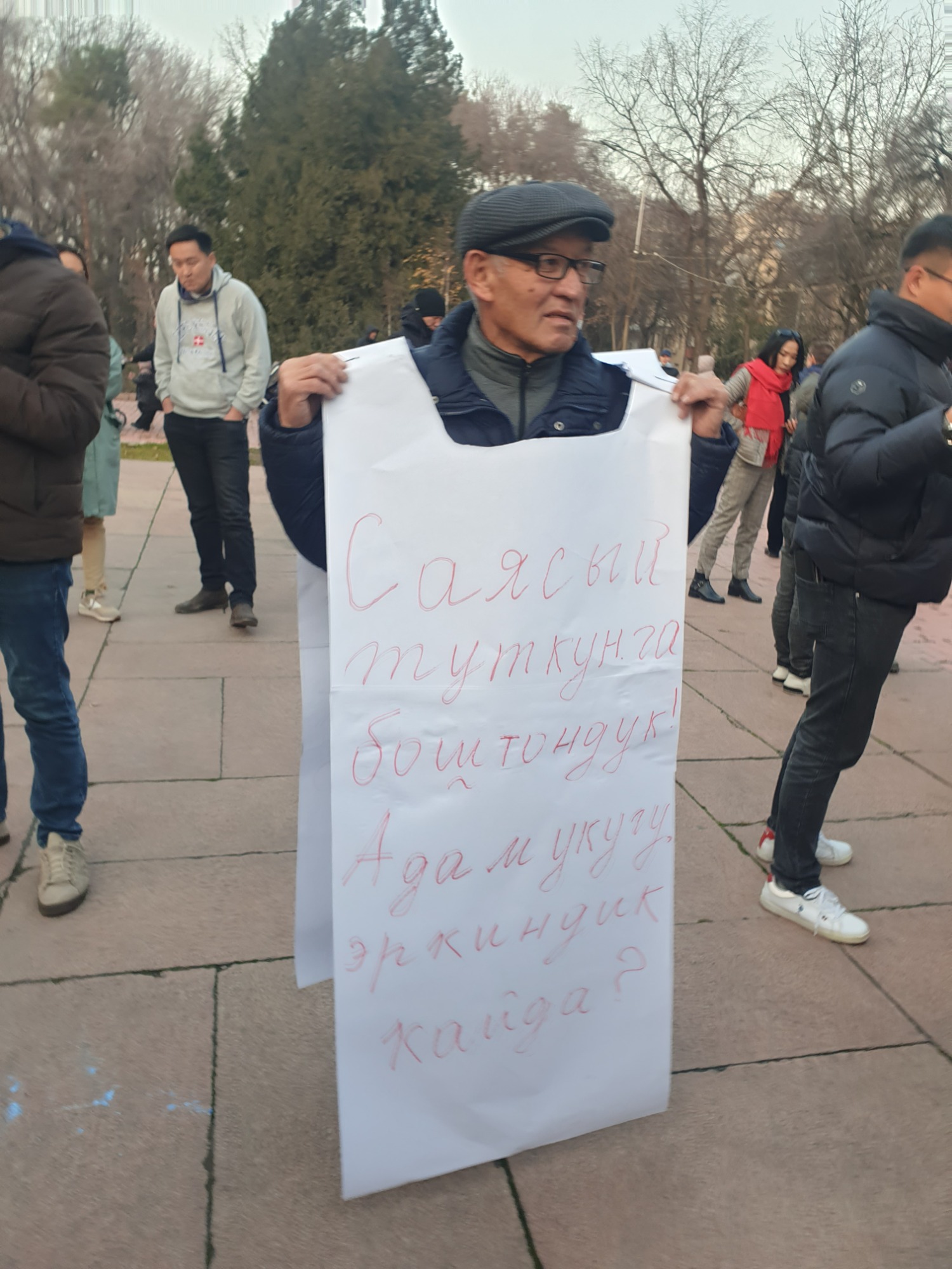 Протестующие требуют вернуть на родину Болота Темирова, освободить политических заключенных, вернуться в правовое русло и освободить свободу слова из клетки.