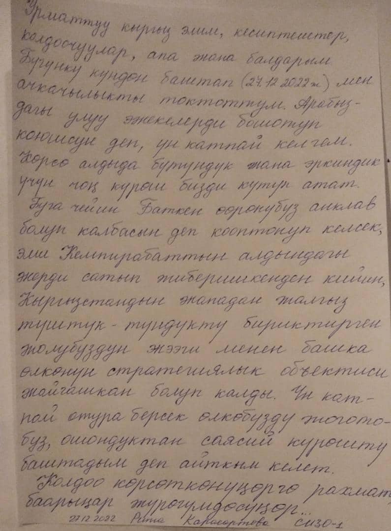 В нем указывается, что Рита Карасартова прекратила голодовку 27 декабря. Она отметила, что всех задержанных ждет борьба за свободу.
