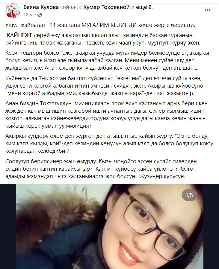 «Оказывается, разведенная сестра мужа погибшей критиковала невестку за одежду, еду, бывало, била и душила. Коллеги говорят, что в последнее время она постоянно плакала в учительском кабинете. В день смерти педагог поздно ушла домой. Напоследок оставила письмо супругу и написала, что он не смог ее защитить, и попросила заботиться об их совместной дочери», — написала Баяна Кулова.
