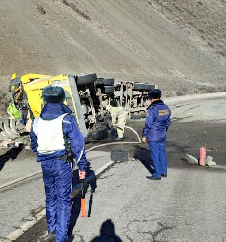 По ее данным, вчера на 113-м километре автодороги Бишкек — Ош бензовоз врезался в бетонный парапет и перевернулся.