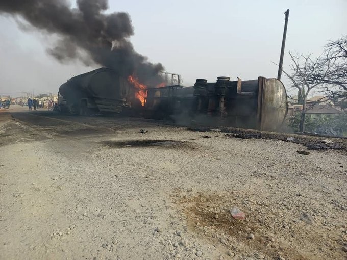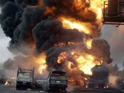 Уточняется, что взрыв произошел, когда автоцистерна попала в аварию на перекрестке. Бензовоз опрокинулся на бок.