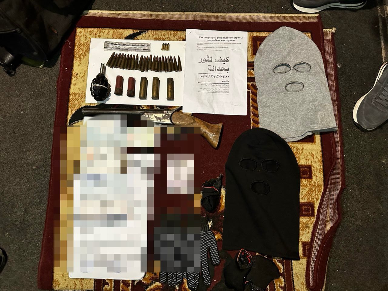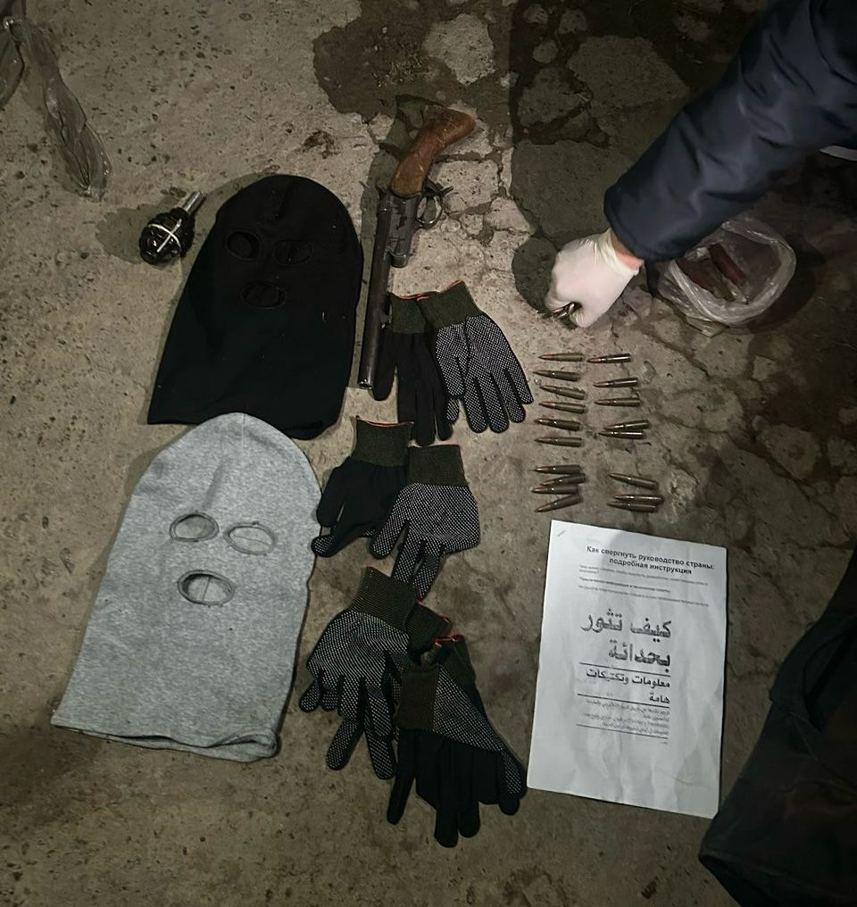 Сегодня, 24 февраля, правоохранители задержали 11 человек, среди которых экс-депутат Жогорку Кенеша. Во время обыска у них обнаружили гранату, обрезы, пистолет, боеприпасы, камуфляжную форму, наркотики, религиозную литературу, специальные маски, инструкции по организации массовых беспорядков, холодное оружие, автомобильные номера, мобильные телефоны, флэш-карты и прочее. Все они водворены в ИВС.