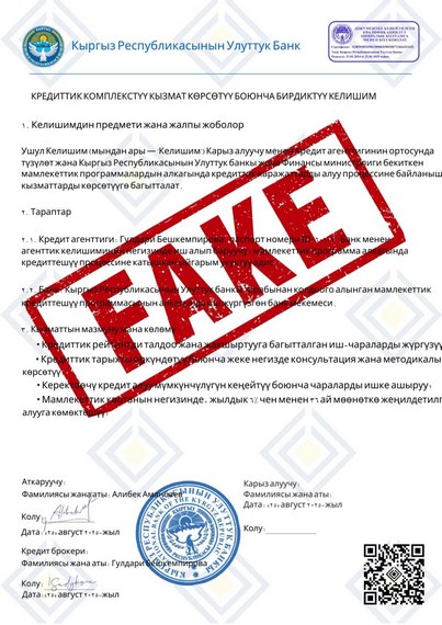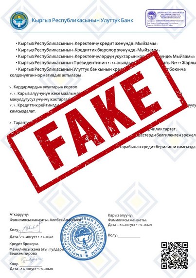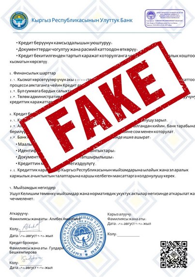 Для убедительности демонстрируют поддельные документы с логотипом НБ КР и фейковые положительные отзывы в Telegram от клиентов, якобы получивших кредиты. Далее злоумышленники под различными предлогами (страховка, комиссия и так далее) просят граждан перевести им деньги и направляют поддельный кредитный договор.