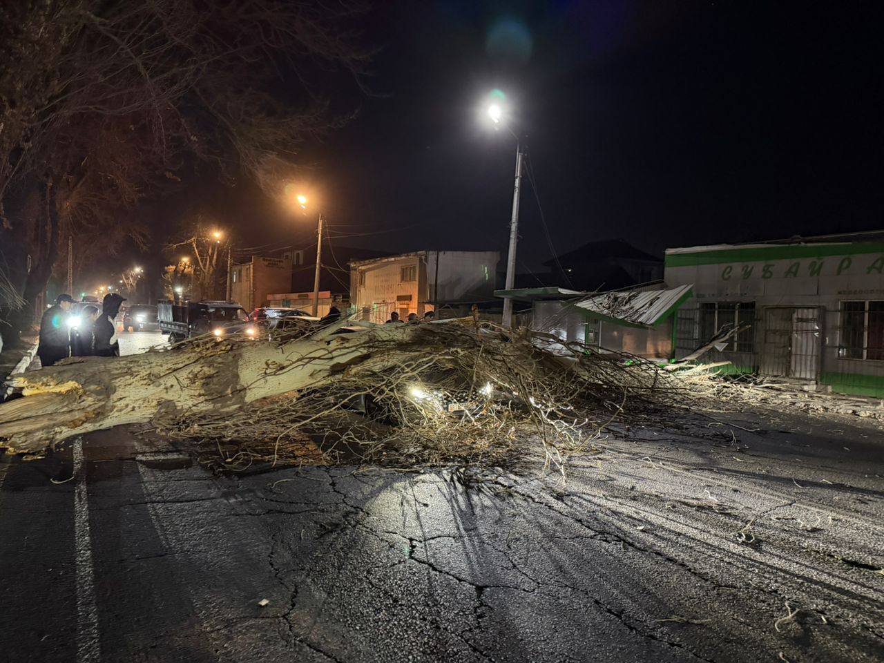 В Бишкеке ночью на улице Элебесова упал крупный тополь и при падении задел проезжавшую мимо машину. Фото происшествия очевидцы опубликовали в социальных сетях.