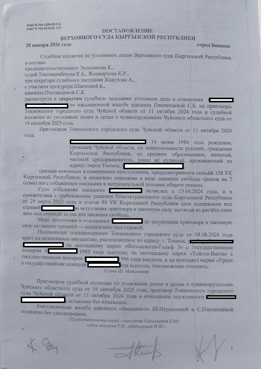 На эту кассацию мы обжалование не подавали, поскольку не знали, что нужно это делать. Наш госадвокат нам объяснил, что переживать не стоит, мы уже выиграли, кассация проверяет только процессуальные ошибки, а их в деле, по его словам, нет. Вообще наш государственный адвокат ничего не делал, мы с детьми сами писали какие-то ходатайства, обжалования. Но после того как он заверил, что все будет хорошо, мы с детьми расслабились. Нам сказали, что нас вызовут в Верховный суд, мы ждали. Но в начале февраля 2026 года адвокат сообщил, что наше дело снова в Токмоке. Оказалось, что заседание в ВС КР провели без нас, явно нарушив права моих детей и меня. Нас даже не оповестили, когда состоится заседание. Мы с дочерью всегда добросовестно приезжали на все суды, а в этот раз даже не дали сказать нам слово», — посетовала женщина.