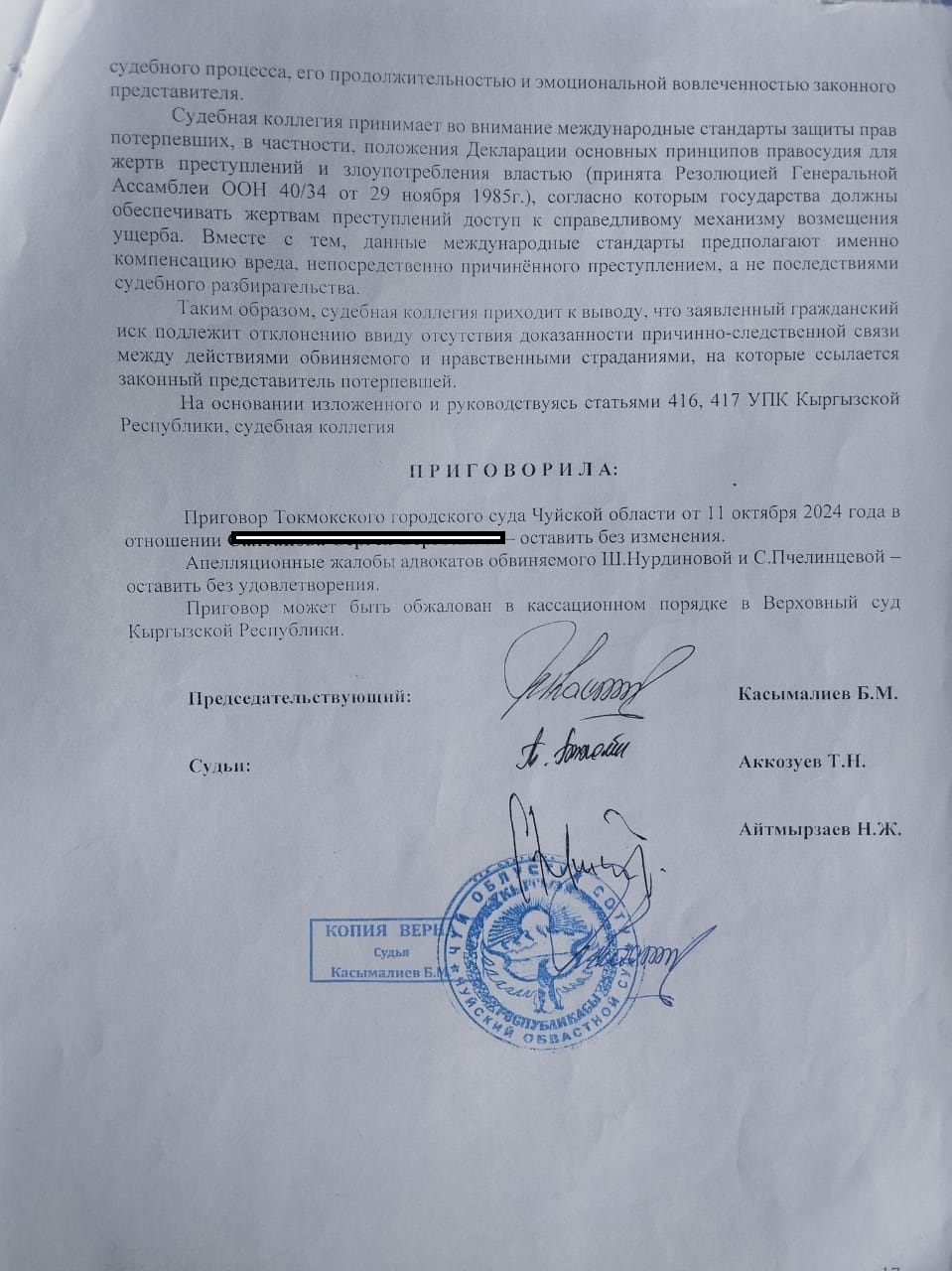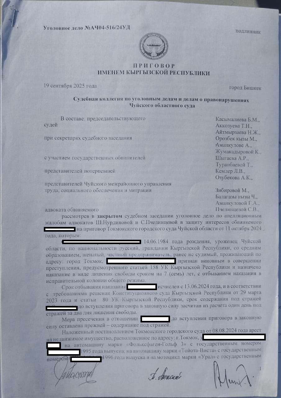 «Суды первой инстанции длились около полугода, его осудили на семь лет по статьям 158 (развратные действия) и 34 (продолжаемое преступление). У стороны ответчика за это время поменялось три адвоката, меня с детьми защищает государственный. Они подали апелляцию в областной суд, было более 12 заседаний. Один раз полностью поменялся состав судей. В итоге облсуд оставил приговор первой инстанции без изменений. С.С. отправили в колонию № 10 в Джалал-Абаде. Он просидел всего несколько месяцев, а потом его адвокат подал кассацию в Верховный суд — просил отменить приговор Токмокского городского суда, а материалы уголовного дела направить в Чуйский областной суд для нового рассмотрения.