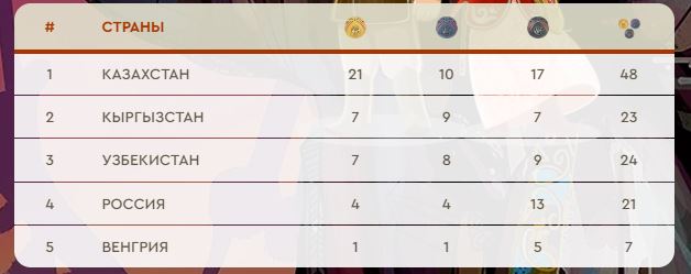 Среди медалей у Кыргызстана награды в мас-рестлинге, аударыспаке, стрельбе из лука и борьбе куреш.