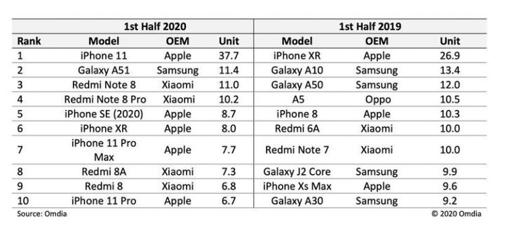 Наиболее популярной моделью смартфона, которая продавалась по всему миру наибольшим тиражом, оказался дорогой iPhone 11 — 37,7 миллиона экземпляров. Второе место с большим отставанием занял Samsung Galaxy A51 с 11,4 миллионами трубок, а вот Xiaomi Redmi Note 8 продали ненамного меньше — 11 миллионов. Интересно, что в мировой топ-10 самых продаваемых смартфонов входят пять моделей от iPhone и четыре от Xiaomi.