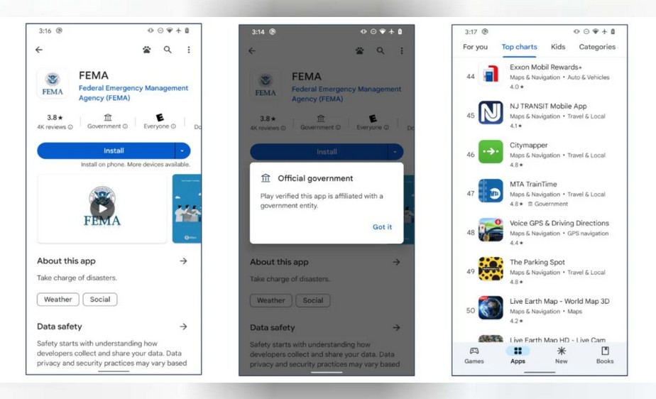 Пока значком помечают приложения из Австралии, Бразилии, Великобритании, Германии, Индии, Индонезии, Канады, Мексики, США, Южной Кореи и Японии. Например, он есть у приложения NASA и американского Федерального агентства по управлению в чрезвычайных ситуациях (FEMA). Отмечается, что в Play Store тестировали новую функцию на протяжении нескольких месяцев.