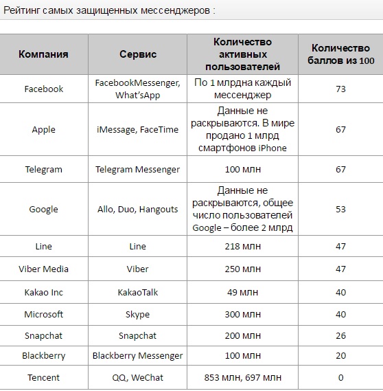 - Возглавили рейтинг Facebook Messenger и WhatsApp (оба принадлежат компании Facebook), которые получили 73 балла из 100 возможных.